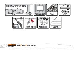 Pour la coupe du bois avec clous ou métal, aggloméré, plastiques renforcés de fibres de verre et époxy, tranches de mur en bois ou métal de moins de 250mm (10") d'épaisseur. Pour travaux de sauvetage ou démolition.