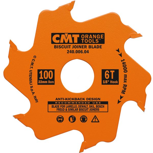 Le nuove lame CMT 100mm per giunzioni con biscotti con marchio arancio, con rivestimento in resina fluorocarbonica PTFE, rendono semplice e veloce la giunzione con biscotti. Acciaio tedesco di alta qualità e 8 denti in metallo duro di micrograno garantiscono anni di durata.