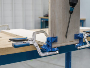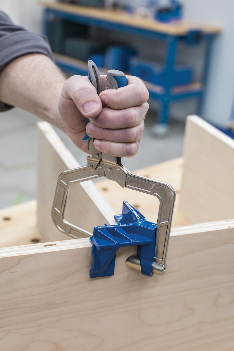 Il morsetto angolare a 90° Kreg® rende più facile che mai assemblare con successo scatole, armadietti, cassetti, e casse dandoti la mano in più di cui hai bisogno per tenere insieme questi blocchi con angoli perfetti di 90°.