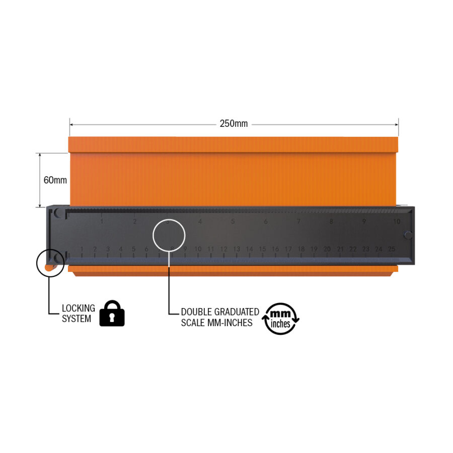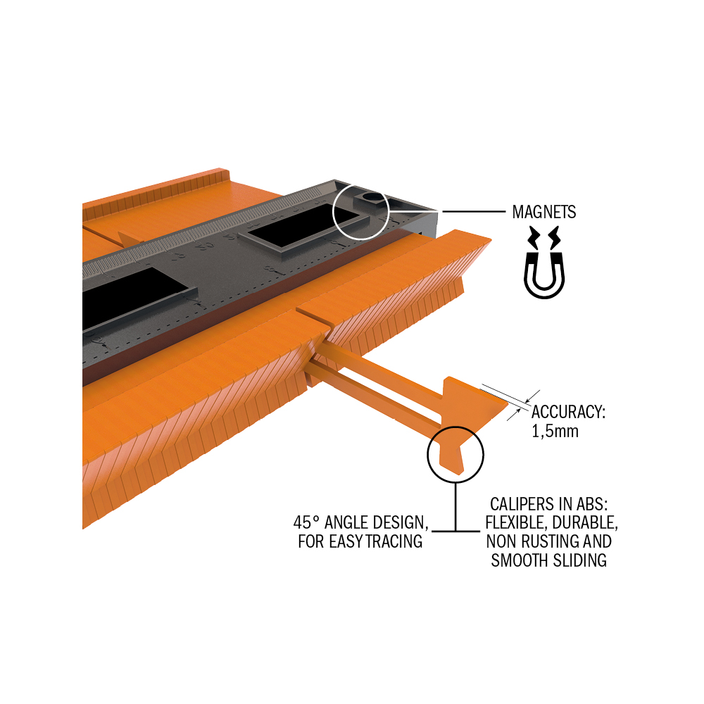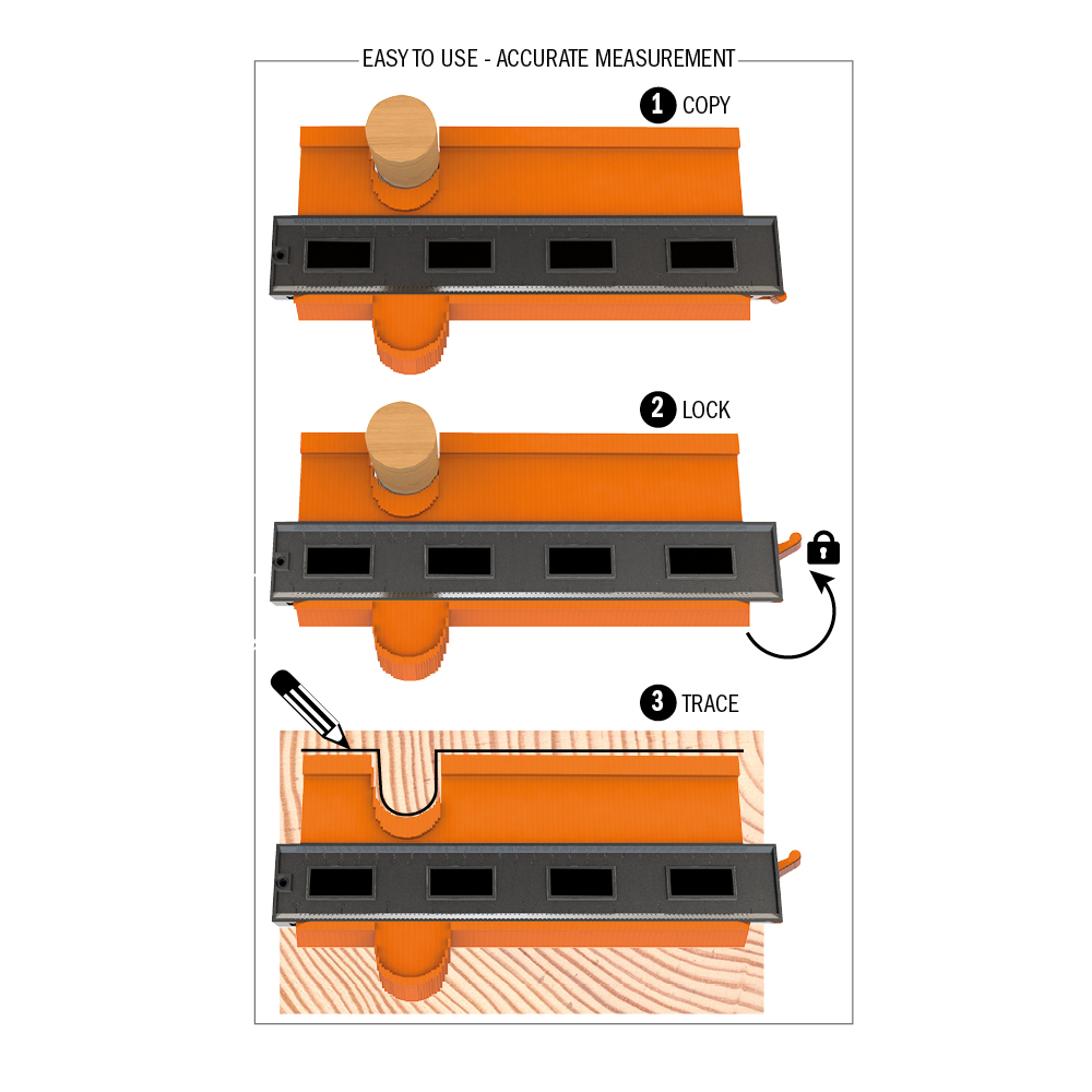 Grazie alla leva di bloccaggio otterrete una traccia precisa del profilo da realizzare e quindi montaggio e installazione saranno perfetti, senza scarti o sprechi.