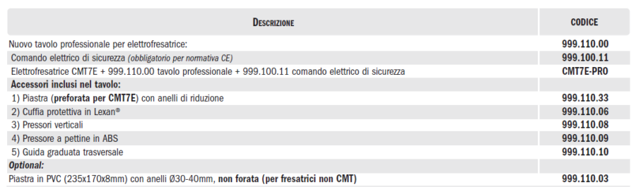 | Elettrofresatrice CMT7E + 999.110.00 tavolo professionale + 999.100.11 comando elettrico di sicurezza | CMT7E-PRO |