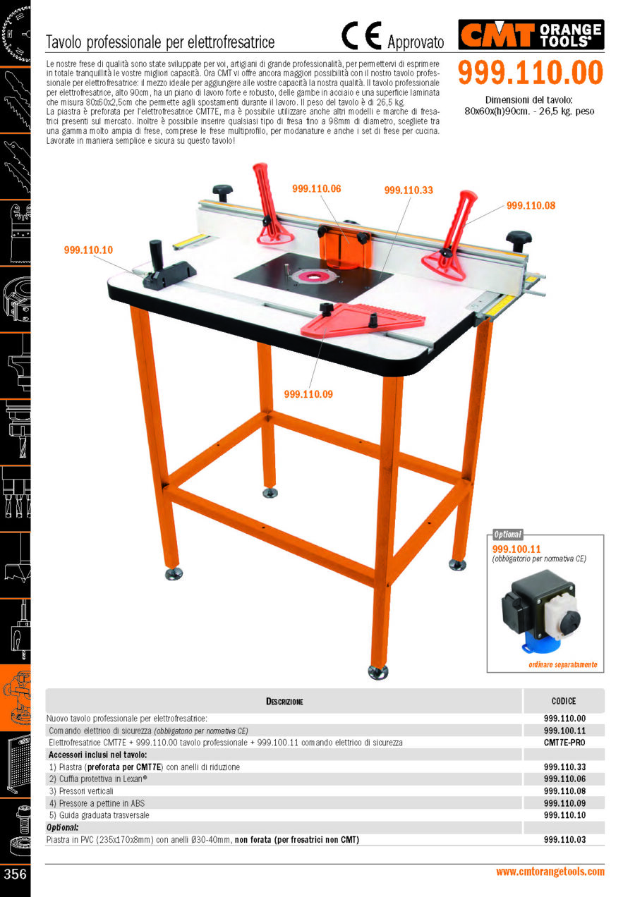 NOTA: L’elettro-fresatrice non è compresa nell’ordine del tavolo 999.110.00 (è compresa nell’articolo CMT7E-PRO, che comprende elettrofresatrice + tavolo professionale + interruttore di sicurezza).